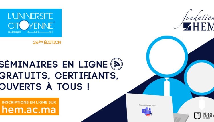 فتجت مؤسسة HEM، عبر الجامعة المواطنة، المجال أمام الجمهور الواسع للولوج إلى المعرفة وتنمية المدارك، وذلك بتنظيمها ندوات مجانية ومصادق عليها ومفتوحة لمواطني العالم، حيث ستنطلق يوم 21 يناير 2023، النسخة 26 من الجامعة المواطنة، والتي ستكون 100٪ عبر الإنترنت، وذلك للسنة الثالثة على التوالي.