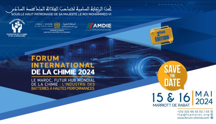تنظم فدرالية الكيمياء وشبه الكيمياء، برعاية سامية من صاحب الجلالة الملك محمد السادس، الدورة الثانية من المنتدى الدولي للكيمياء في العاصمة الرباط، وذلك في الفترة من 15 إلى 16 مايو 2024. ويهدف المنتدى، الذي يُقام بشراكة مع وزارة الصناعة والتجارة والوكالة المغربية لتنمية الاستثمارات والصادرات، إلى جمع الأطراف الفاعلة في مجال الصناعة الكيميائية لمناقشة فرص التعاون في مجال صناعة بطاريات السيارات الكهربائية عالية الأداء.