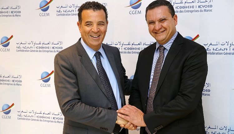 باشر محمد بشيري، الرئيس بالنيابة السابق، و شكيب لعلج، الرئيس الحالي للاتحاد العام لمقاولات المغرب، يوم 24 يناير 2020 في مقر المنظمة بالدار البيضاء، إجراءات نقل الصلاحيات.