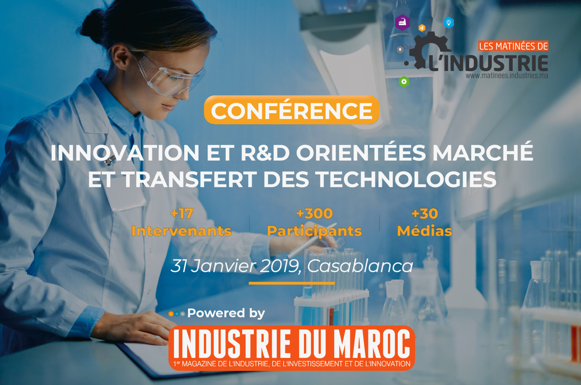 استنادا إلى النجاح المبهر الذي حققته الدورة الثانية من صباحيات الصناعة حول تيمة الجيل الرابع من الصناعة، تنظم مجلة صناعة المغرب  “Industrie Du Maroc” يوم الخميس 31 يناير 2019  بالدار البيضاء الدورة الثالثة لـ صباحيات الصناعة”Matinées de l’Industrie”، تحت شعار  “البحث والتطوير والابتكار الموجه نحو السوق”. هذه الدورة يتوخى من خلالها تعزيز التعاون بين المتخصصين في مجال الابتكار والبحث العلمي من جهة وبين عالم المقاولة والمصنعين من جهة أخرى.