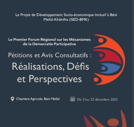 ينظم مشروع التنمية الاجتماعية والاقتصادية الدامجة بجهة بني ملال خنيفرة (ISED-BMK) الممول من طرف الوكالة الأمريكية للتنمية الدولية بالمغرب (USAID-Morocco)، المنتدى الجهوي الأول لآليات الديمقراطية التشاركية بجهة بني ملال خنيفرة، وذلك مابين21 و22 دجنبر 2023 بفضاء الغرفة الفلاحية ببني ملال.