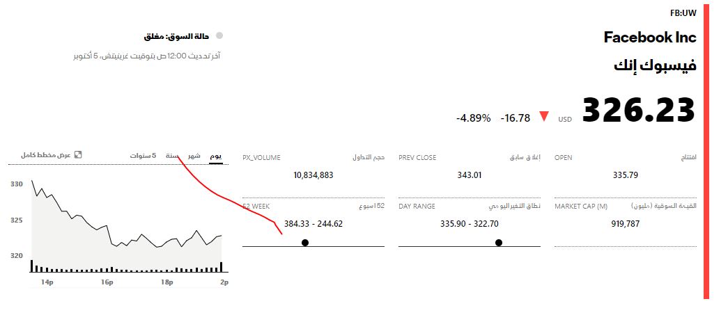 وأدت عمليات البيع المكثفة لانخفاض سهم “عملاق” وسائل التواصل الاجتماعي بنحو 5% ، يوم الإثنين رابع أكتوبر، ليتراجع بنحو 15% منذ منتصف سبتمبر.