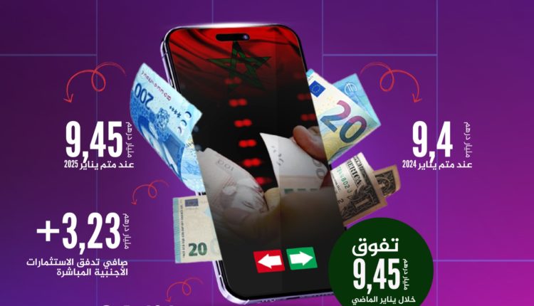 أكد مكتب الصرف بأن تحويلات المغاربة المقيمين بالخارج فاقت 9,45 مليار درهم متم يناير 2025، مقابل 9,4 مليار درهم متم يناير 2024.