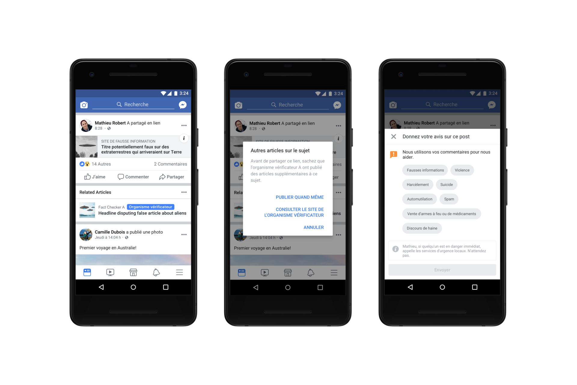 وعندما يكتب المدققون التابعون للطرف الثالث مقالات حول قصة إخبارية ما، سيتم عرضها على منصة فيسبوك في مقالات مرتبطة مباشرةً بالقصة المعنية أسفل “نيوز فيد – Newsfeed “. وسيتلقى مدراء الصفحات والأشخاص على فيسبوك أيضًا إشعارات في حال كانوا يحاولون مشاركة تلك قصة أو قاموا بمشاركتها فيما مضى وتم تقييمها على أنها كاذبة، وبالتالي تمكين المستخدمين من اتخاذ القرار بأنفسهم حول ما يقرأون ويثقون به ويشاركونه.
