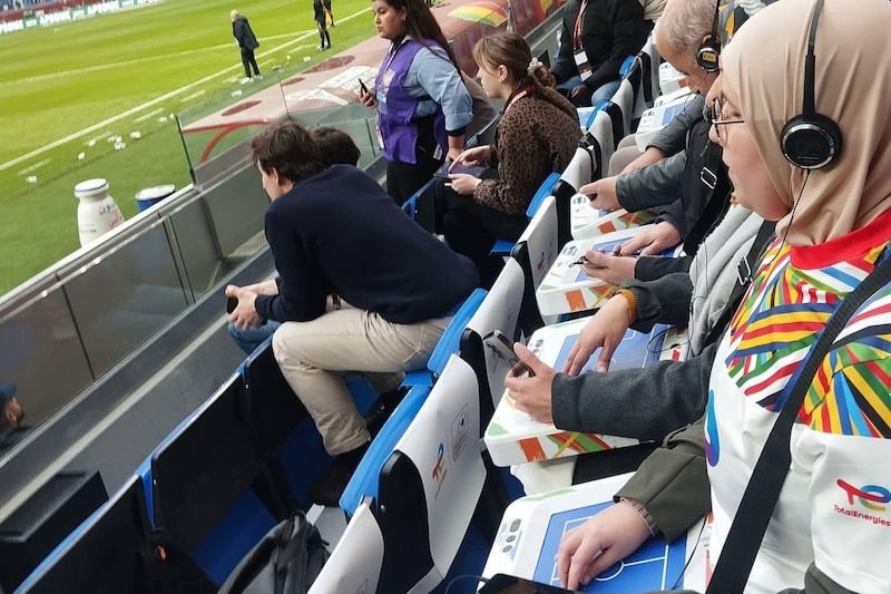 يحصل المشجعون المكفوفون على سماعات رأس خاصة تنقل لهم وصفاً دقيقاً لكل ما يجري على أرض الملعب، بما في ذلك تحركات اللاعبين، اللحظات الحاسمة، وتفاعل الجماهير، مما يتيح لهم عيش أجواء المباريات لحظة بلحظة. كما تم إدماج تقنيات لمس تفاعلية عبر أجهزة لوحية تُمكّن المشجع من تتبع مسار الكرة وحركتها على أرضية الملعب عبر اللمس، في تجربة تجمع بين التكنولوجيا والإحساس المباشر باللعبة.