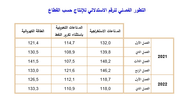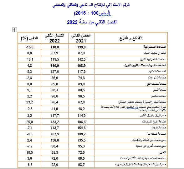 وفيما يتعلق بالرقم الاستدلالي للصناعات الاستخراجية، فقد انخفض رقمه الاستدلالي بنسبة 15,6% وذلك نتيجة الانخفاض المسجل في “صناعات استخراجية أخرى” ب16,1% والاستقرار المسجل في “المعادن الحديدية”.