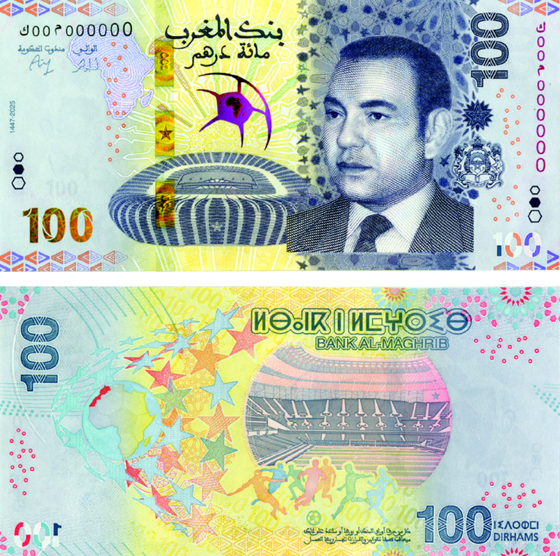 وفي السياق ذاته، أبرز بنك المغرب أن الورقة البنكية التذكارية من فئة 100 درهم تكرس الاهتمام الذي توليه المملكة لتطوير المجال الرياضي، وتسليط الضوء على البنيات التحتية الحديثة التي جرى إنجازها في هذا الإطار.