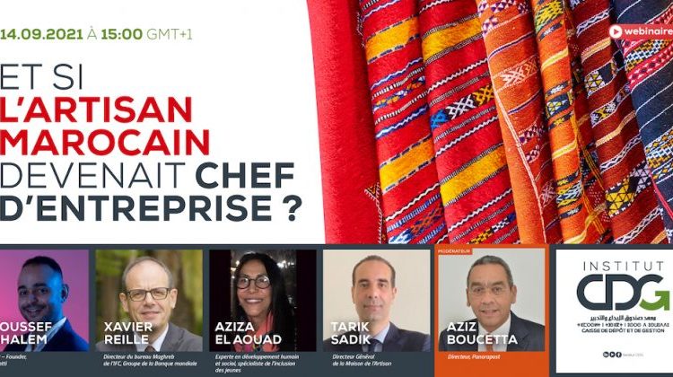 في سياق مأزوم، تأثَّر بسببه أكثر من 2 مليون صانع تقليدي مغربي بشكل فعلي وكبير نتيجة الأزمة الصحية، يأتي انعقاد اللقاء الخامس ضمن سلسلة ندوات “معهد صندوق الإيداع والتدبير INSTITUT CDG ” المعنونة بـ”نظرات نحو المستقبل” لسنة 2021، والمُنظَّمِ، عن بُعد، حول موضوع: “ماذا لو أصبح الصانع التقليدي المغربي صاحب مقاولة؟“. وشارك أربعة متدخلين يُمثّلون أطيافاً اقتصادية من مجالات مختلفة: عزيزة العواد، خبيرة في التنمية البشرية والاجتماعية، متخصصة في إدماج الشباب؛ كزافيي رايلي، مدير مكتب المغرب لشركة التمويل الدولية (مؤسسة مالية تابعة للبنك الدولي ومتخصصة في تنمية القطاع الخاص)؛ طارق صديق : مدير عام “دار الصانع” ويوسف غالم، مؤسس ومدير عام مؤسسة “ميراثي”.